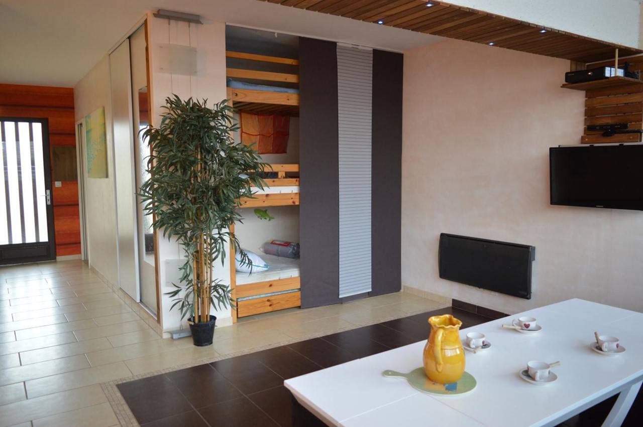 Capbreton (40) - Plage du Prévent - Résidence Océane 2-room apartment - approx. 42 m² - up to 5 people A few steps from the seafront, in the area known as the Triangle d'Or, the Océane residence enjoys an excellent location to forget about the car during the holidays. This rental by the sea, on the ground floor, includes 1 living room with 2 bunk beds + 1 trundle bed, 1 equipped kitchen area, 1 bedroom with 1 double bed, a shower room, 1 WC. The advantages of this holiday apartment: proximity to the beach on foot, private parking. Cleaning with disinfection included.