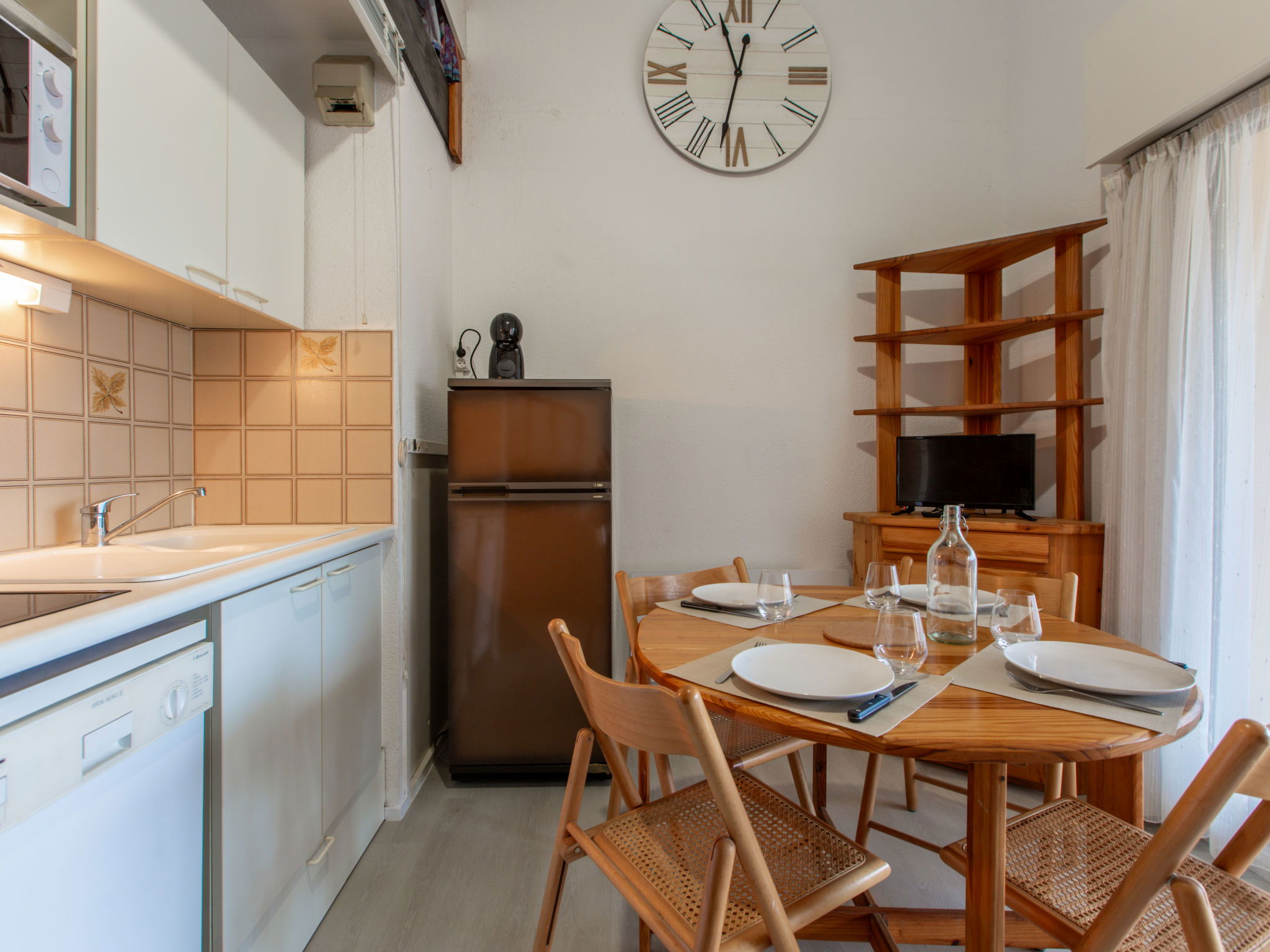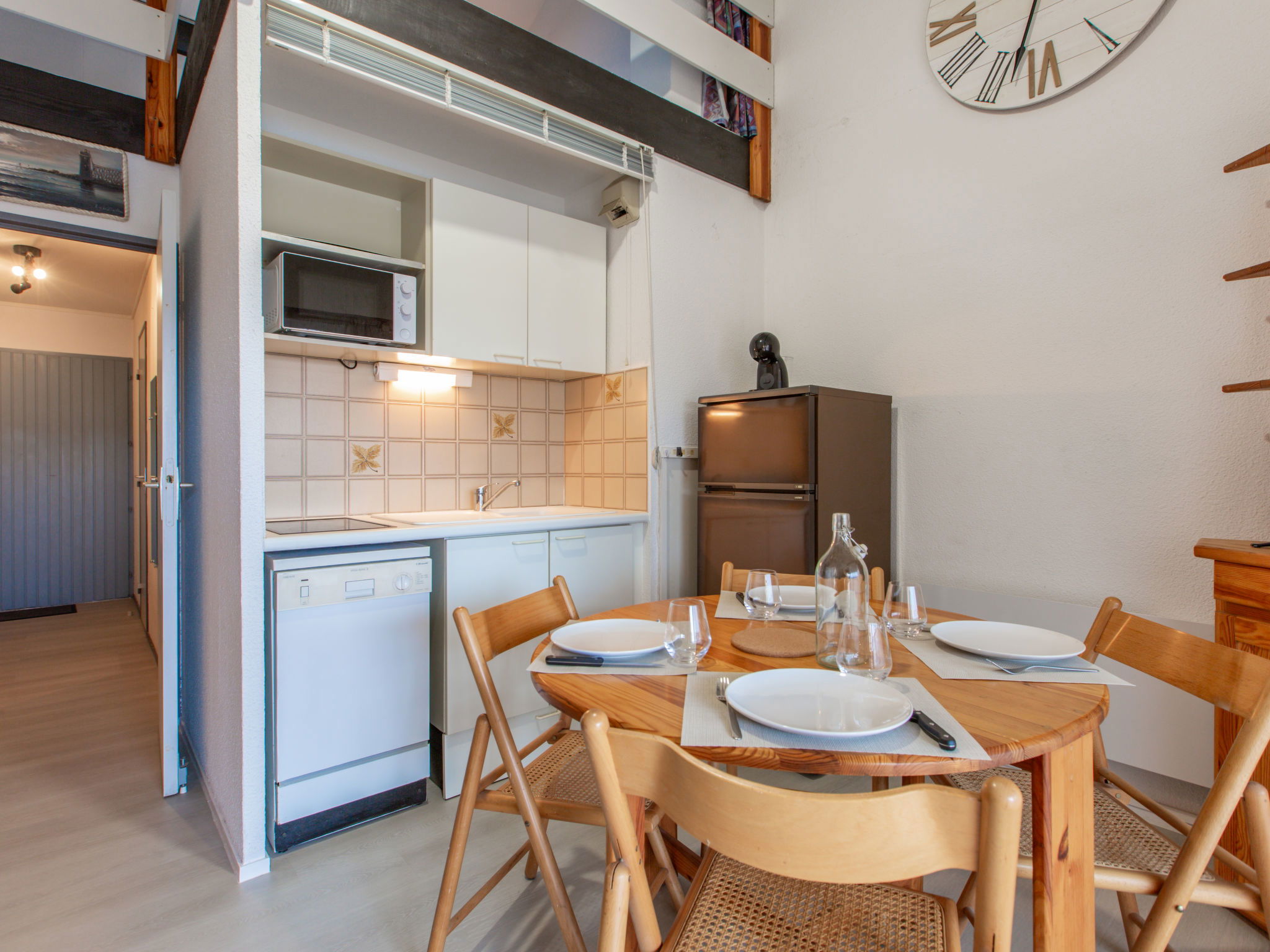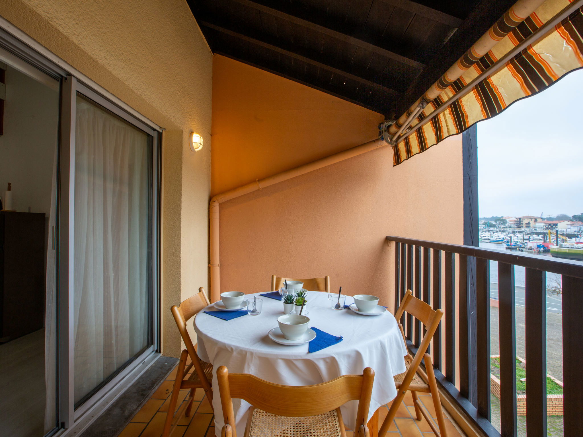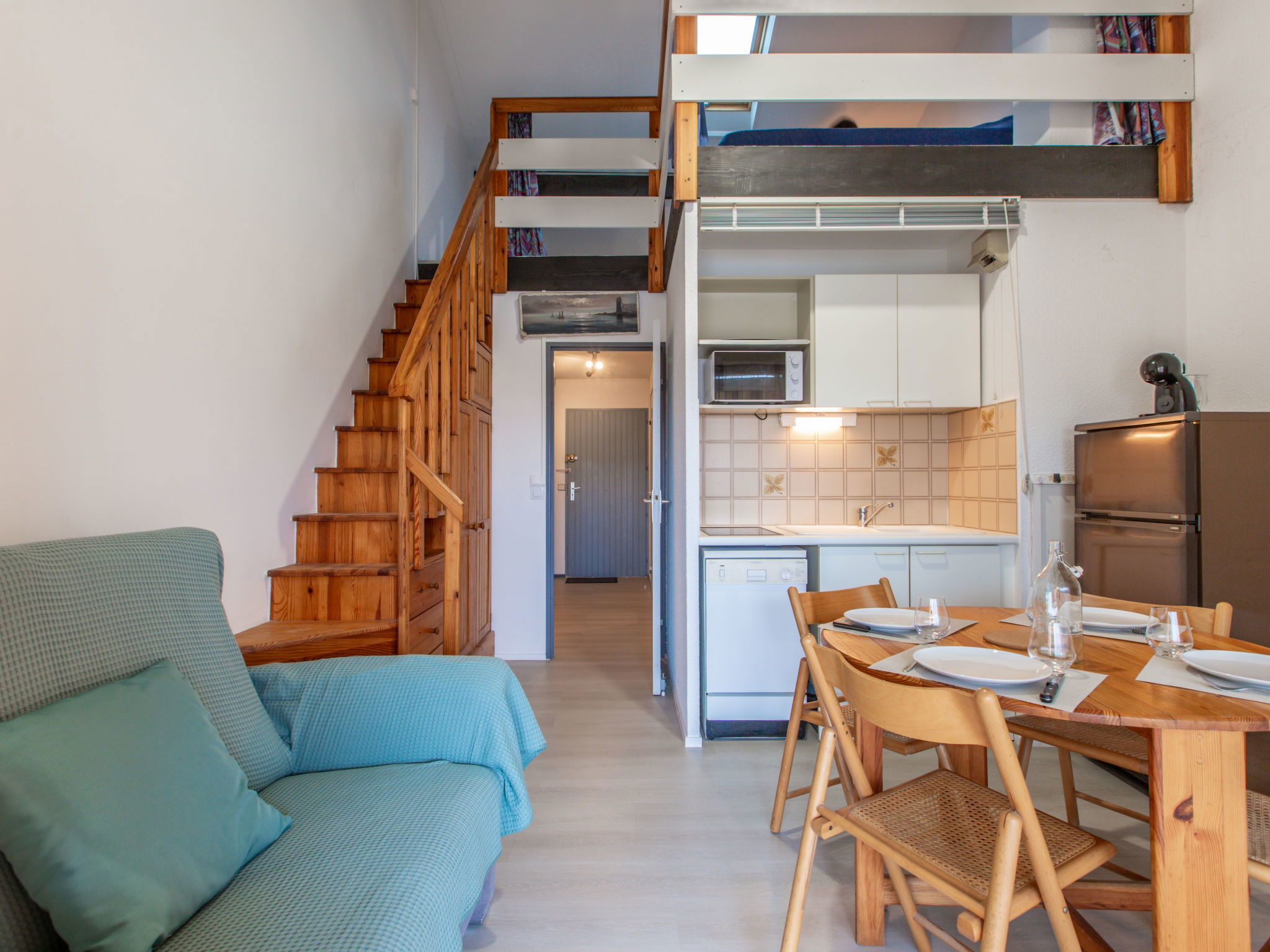 2-room apartment 35 m2 on 2nd floor. Living/dining room with TV and electric heating. Exit to the terrace. 1 room with 1 french bed (140 cm, length 190 cm). Kitchenette (dishwasher, 2 induction hot plates, toaster, kettle, microwave, electric coffee machine). Shower/WC. Upper floor: (steep stair) gallery, ceiling height 180 - 130 cm with 1 french bed (140 cm, length 190 cm). Terrace 12 m2, roofed. Terrace furniture. Of the canal and the port. Facilities: washing machine. Internet (WiFi, extra). Parking space n 133. Please note: non-smokers only. Smoke alarm. Instead of an enclosed bedroom, some sleeping areas are located in an open-plan area (gallery, alcove, etc.). Offer by a private individual according to Art. 155, IV of CGI. 40065001523ES