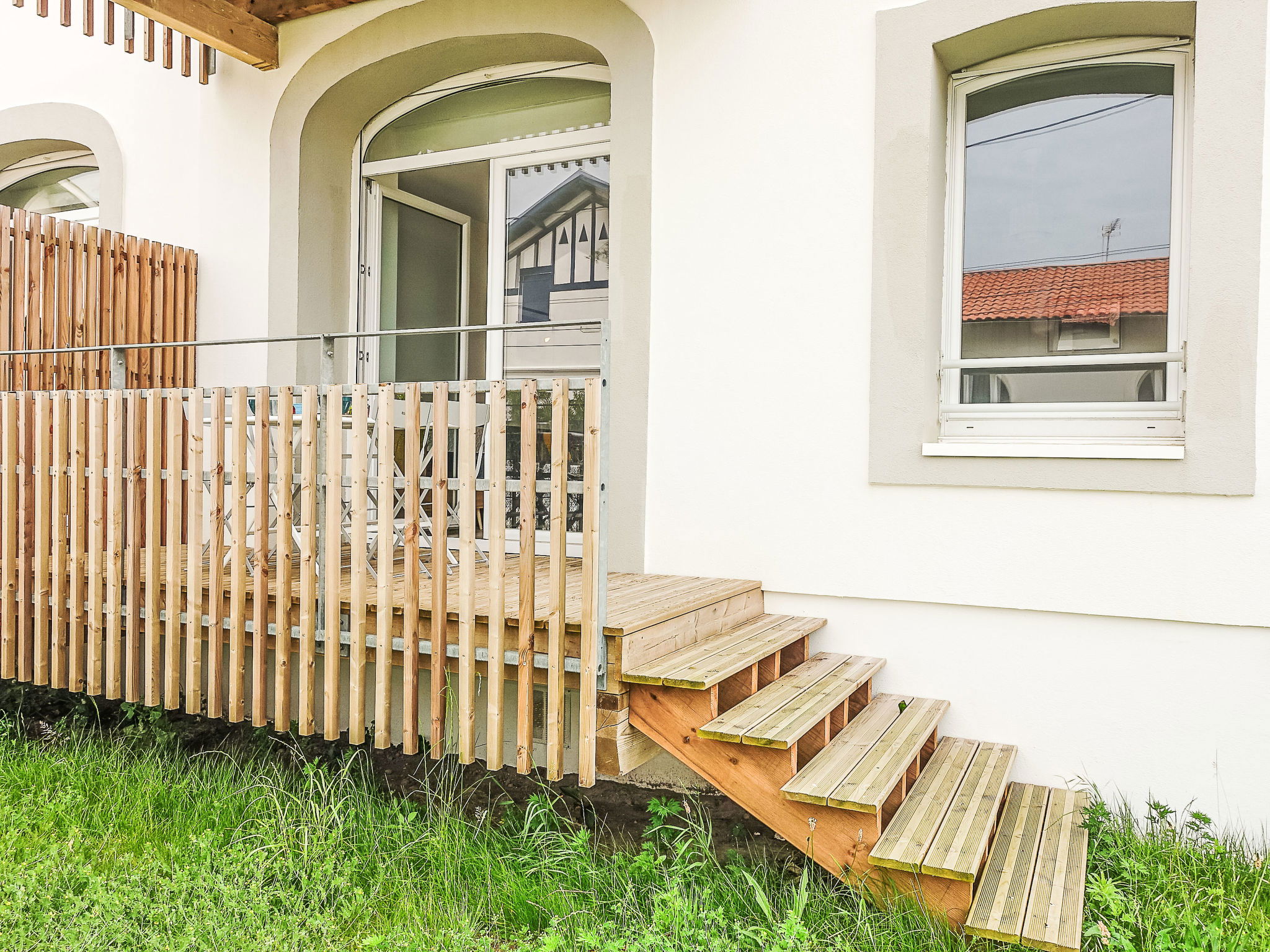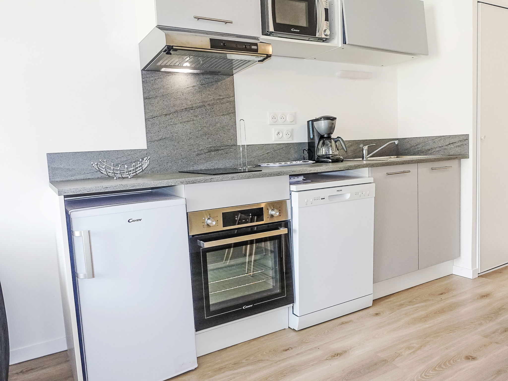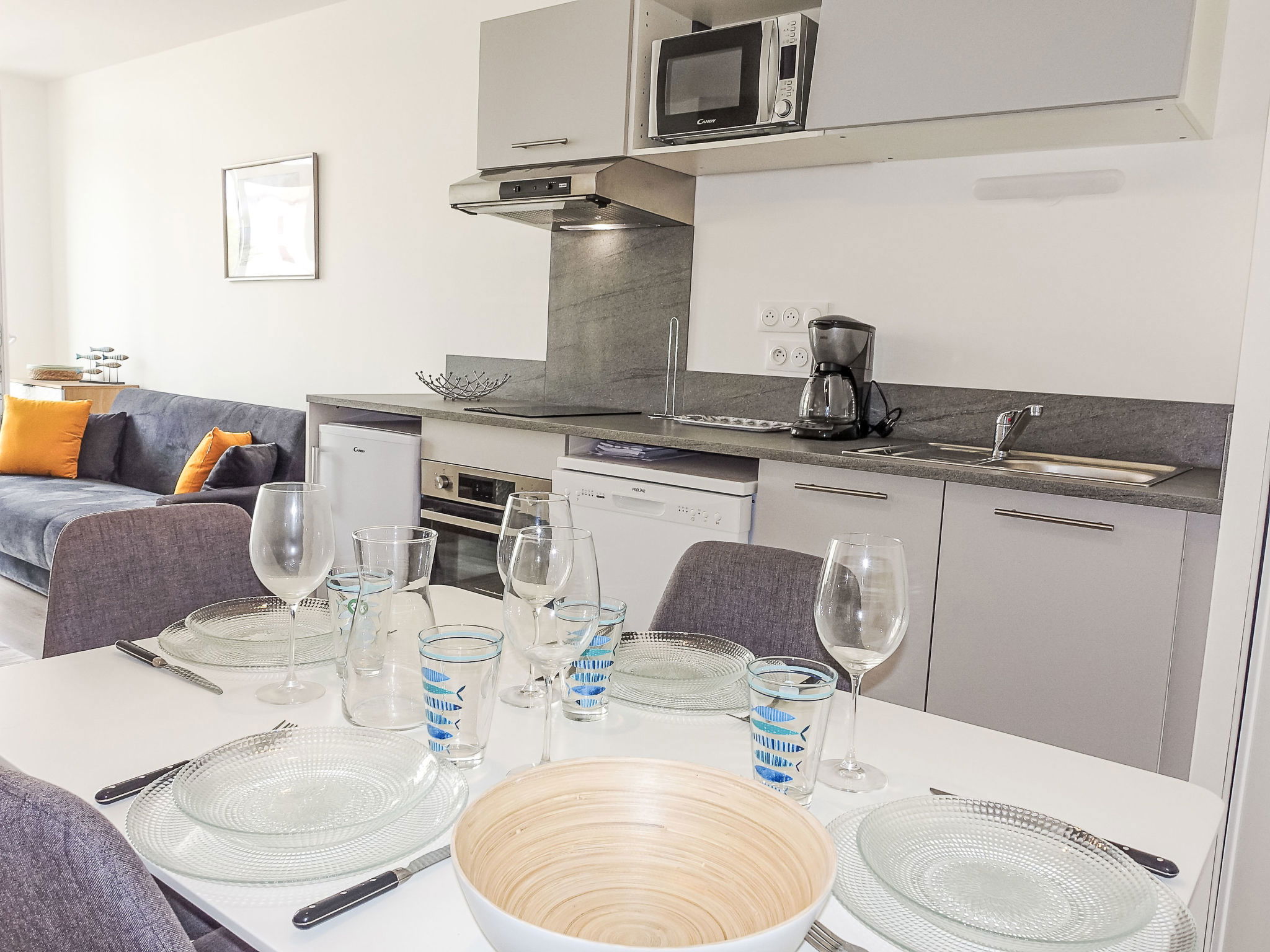 2-room apartment 34 m2, on the upper ground floor. Object suitable for 2 adults + 2 children. Modern and cosy furnishings: living/dining room with 1 sofabed (140 cm, length 190 cm), TV (flat screen). Exit to the terrace, to the patio. 1 room with 1 french bed (140 cm, length 190 cm). Open kitchen (oven, dishwasher, 2 induction hot plates, toaster, kettle, microwave, electric coffee machine). Shower/WC. Electric heating. Small terrace 4 m2, patio 20 m2. Terrace furniture. Facilities: washing machine, hair dryer. Internet (WiFi, free). Please note: non-smokers only. Offer by a private individual according to Art. 155, IV of CGI. 40065001448X9