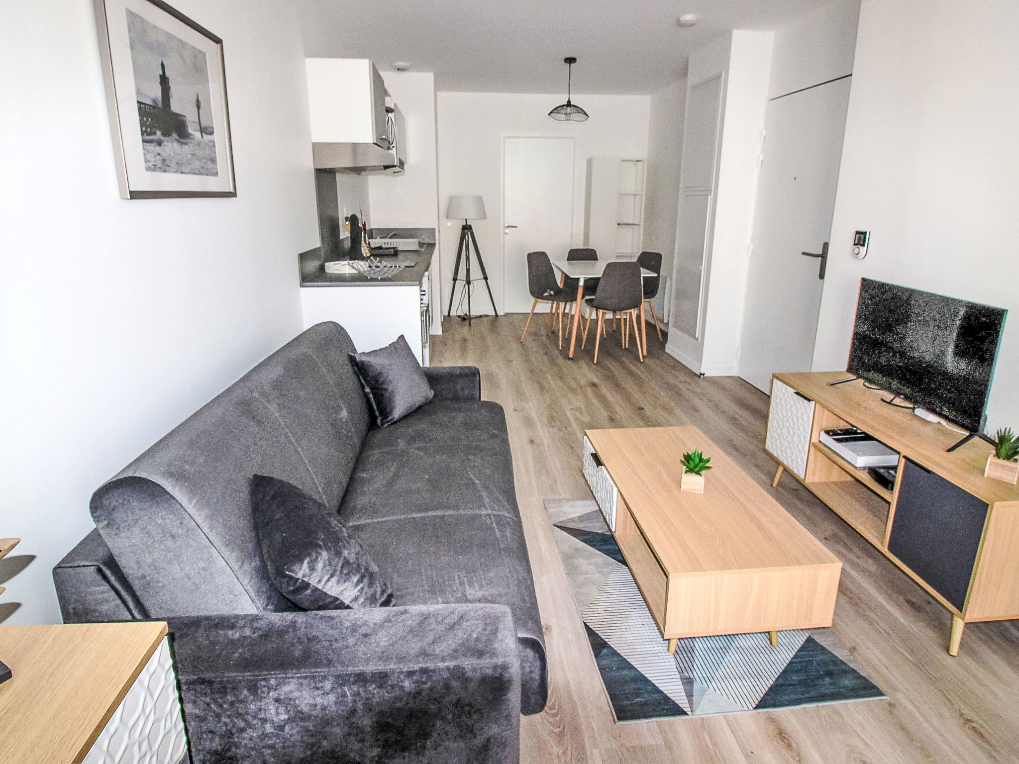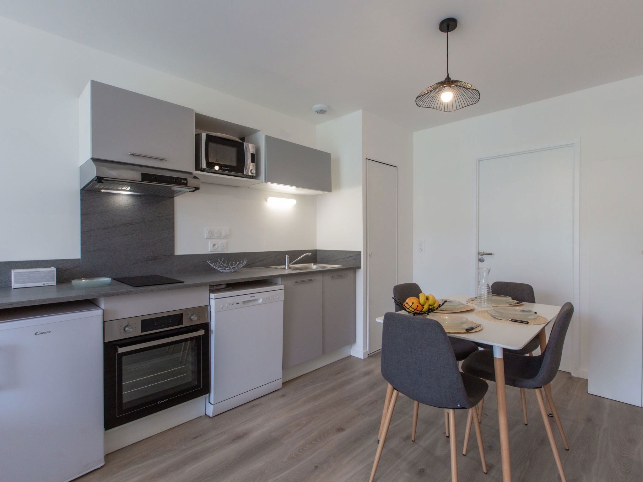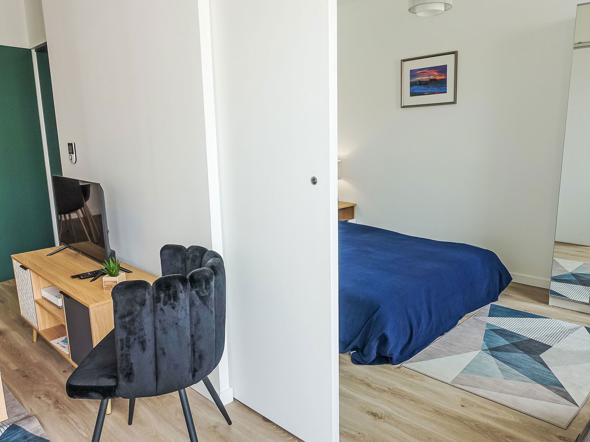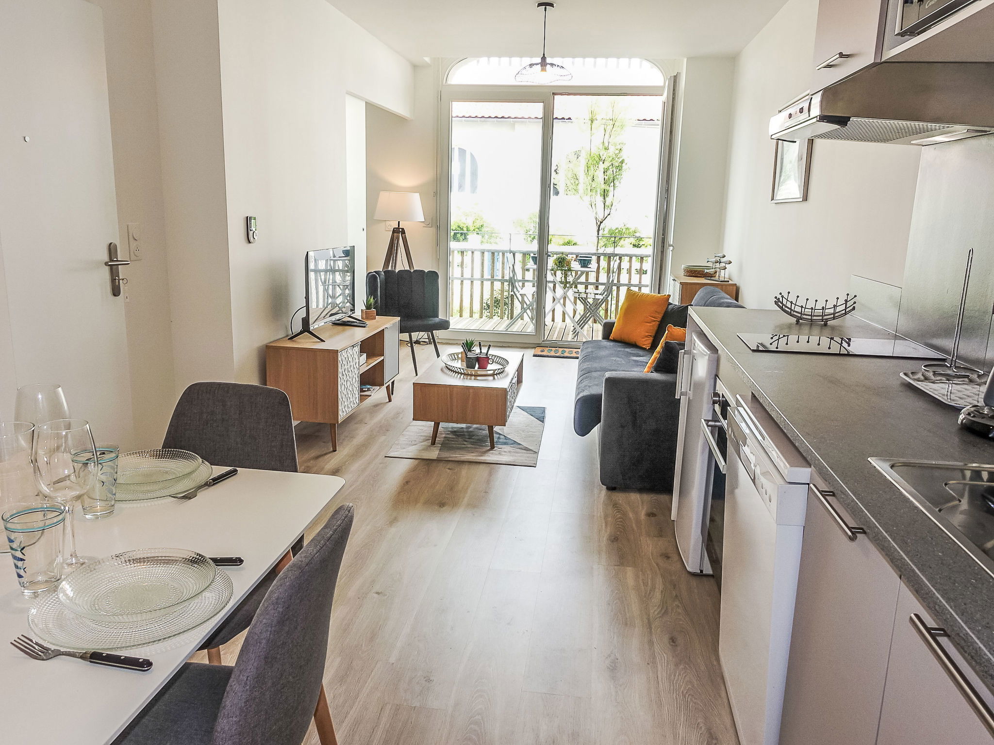 2-room apartment 34 m2, on the upper ground floor. Object suitable for 2 adults + 2 children. Modern and cosy furnishings: living/dining room with 1 sofabed (140 cm, length 190 cm), TV (flat screen). Exit to the terrace, to the patio. 1 room with 1 french bed (140 cm, length 190 cm). Open kitchen (oven, dishwasher, 2 induction hot plates, toaster, kettle, microwave, electric coffee machine). Shower/WC. Electric heating. Small terrace 4 m2, patio 20 m2. Terrace furniture. Facilities: washing machine, hair dryer. Internet (WiFi, free). Please note: non-smokers only. Offer by a private individual according to Art. 155, IV of CGI. 40065001448X9