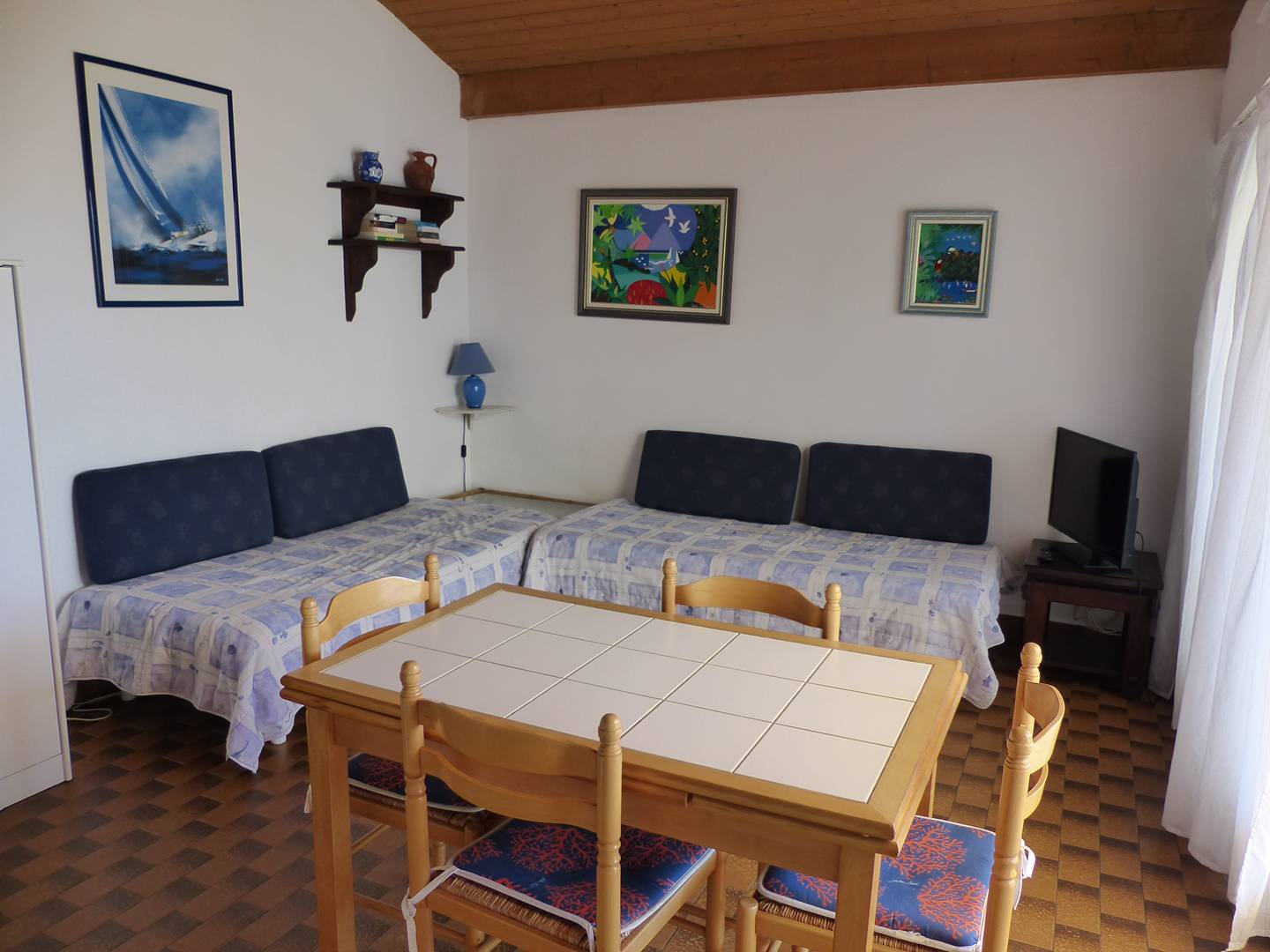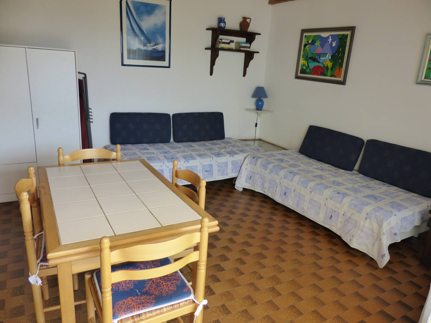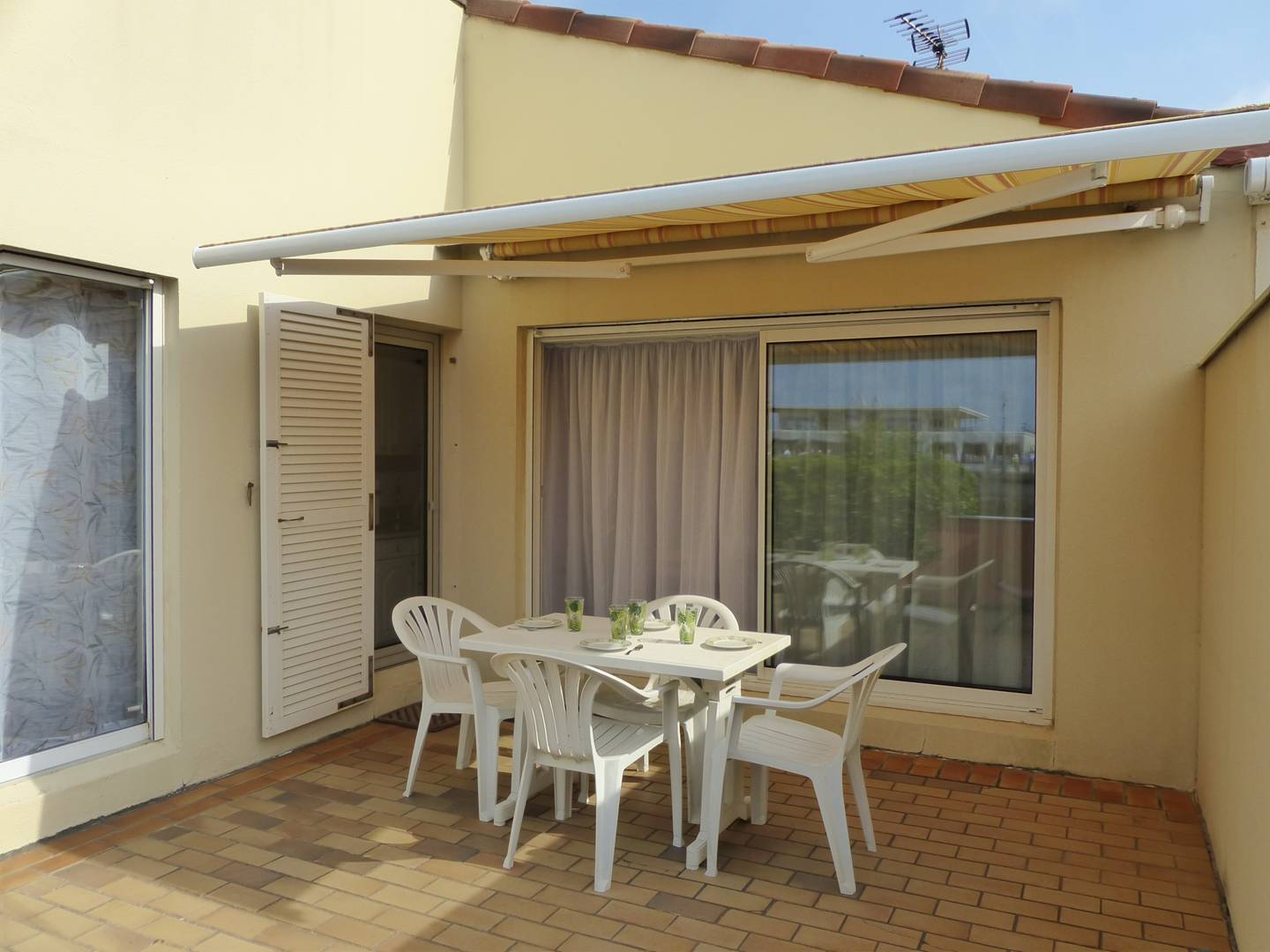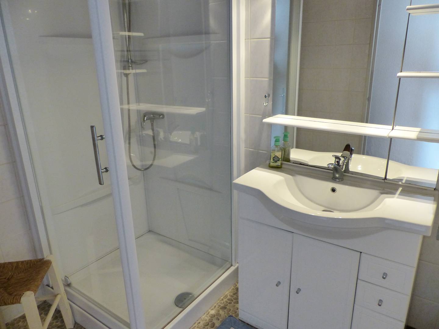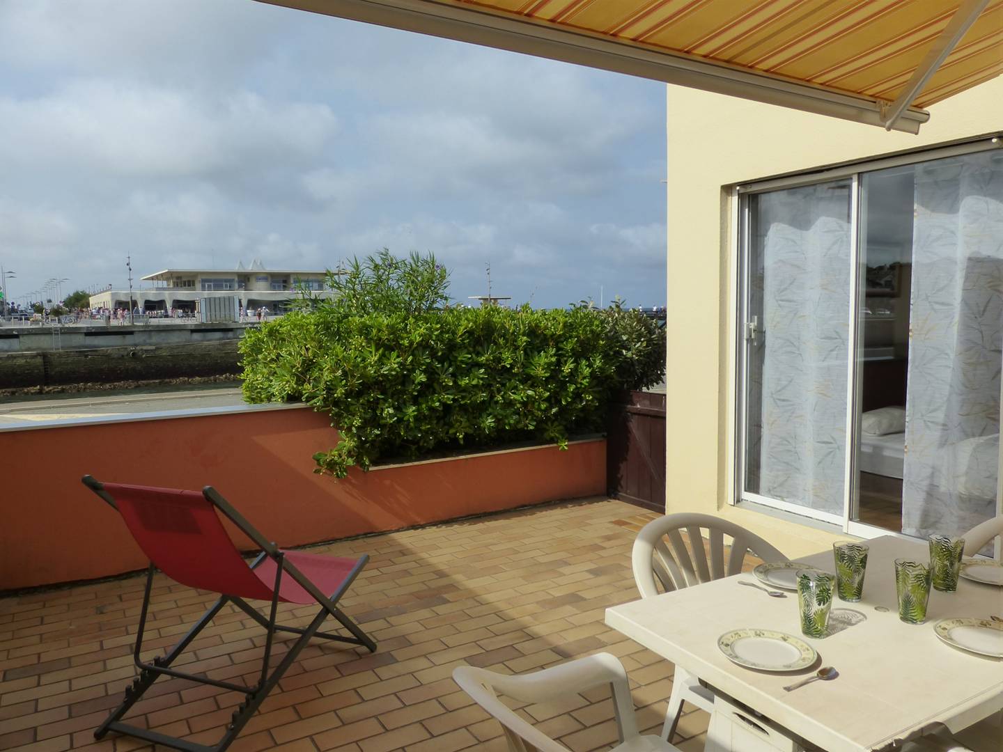 Entrance - Living room (3.82 x 3.78) with 2 single beds opening onto a south-facing terrace (14.80 m²) - Magnificent view of the channel and the fishing port (small gate allowing direct exit to the canal promenade) - Kitchen area: 3-burner induction hob, microwave oven, fridge-freezer, washer-dryer and dishwasher. Bedroom (2.56 x 3.76) opening onto the terrace: 1 bed 160. Shower room (sink and shower). WC.