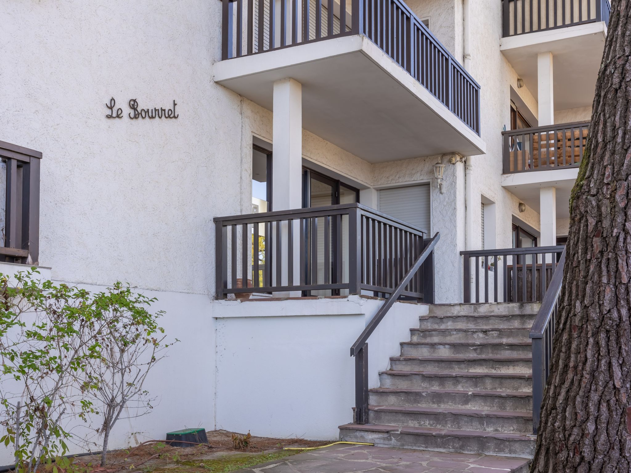 Residence "Le Bourret", 3 storeys. 500 m from the centre of Hossegor, 800 m from the sea, 800 m from the beach. Shop 500 m, restaurant 300 m, bar, café, bicycle rental 500 m, bus stop "Parc des sports" 600 m, sandy beach "la centrale" 800 m. Golf course (18 hole) 1 km. Small shared wooded park. On the edge of the Capbreton harbour.