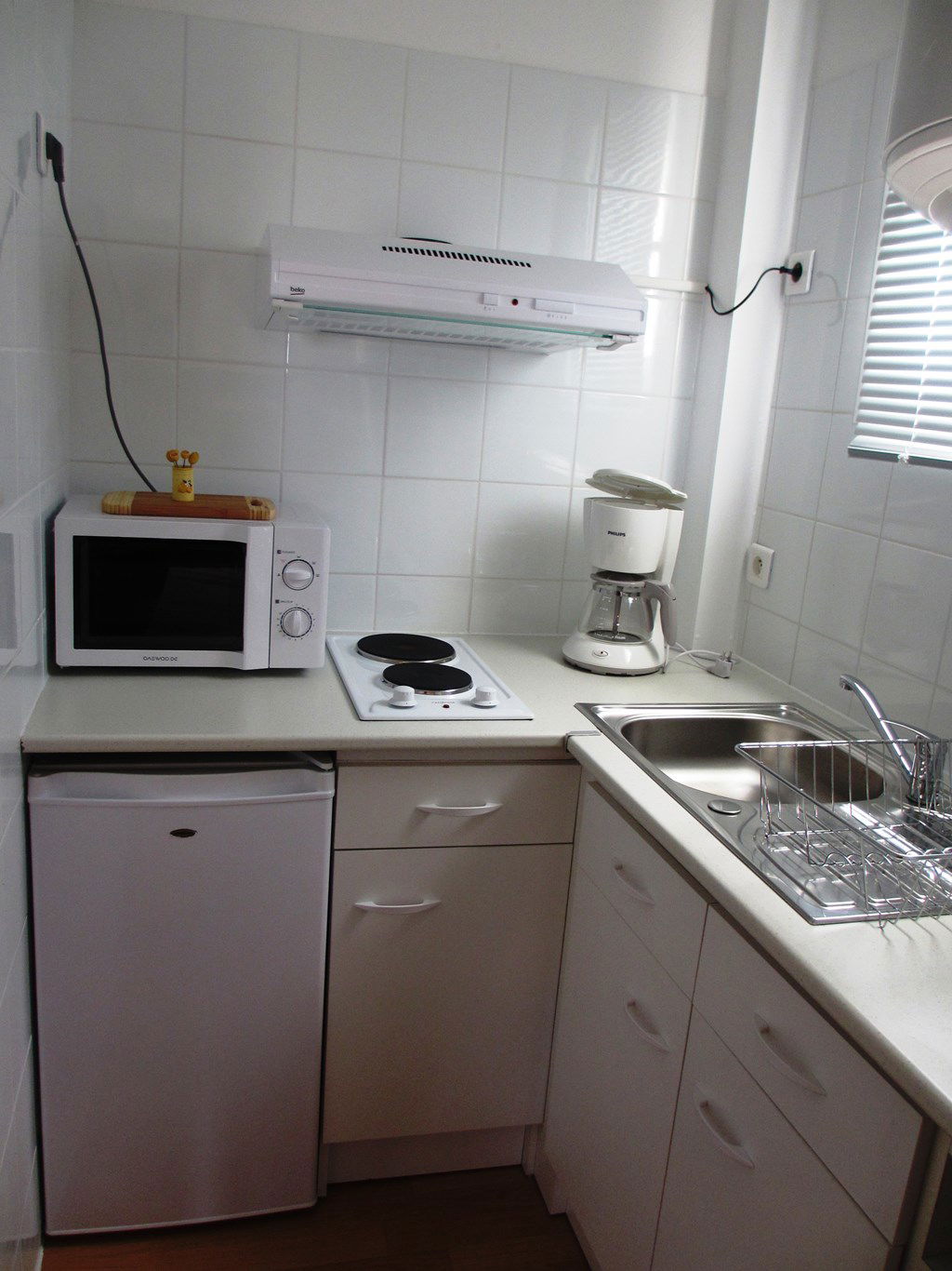 Kitchen area (1.6x1.37): top fridge, 2-burner electric hob and microwave.