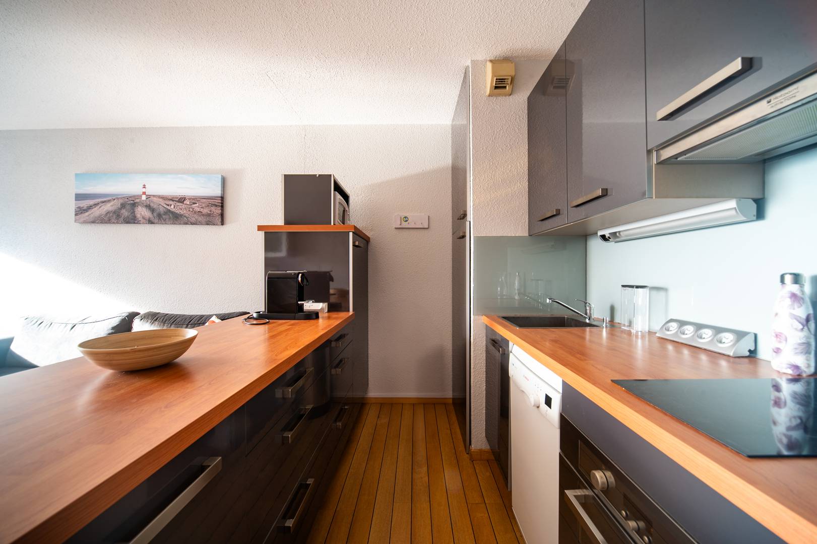 The apartment comprises an entrance hall and a bright living room with a modern, fully equipped open-plan kitchen (ceramic hob, oven, dishwasher, washing machine, refrigerator and microwave). The balcony has been converted into a dining area, creating a spacious living room.