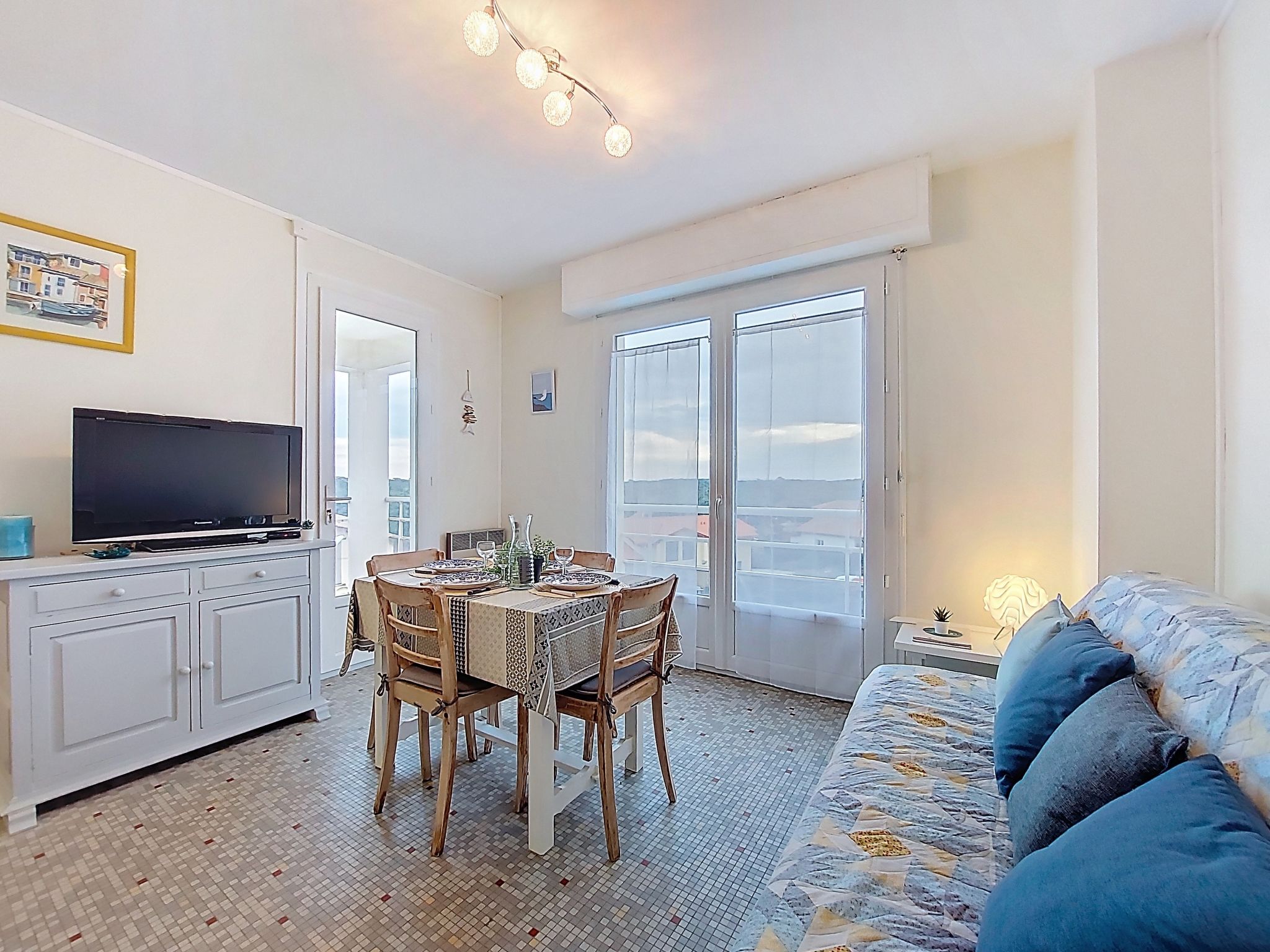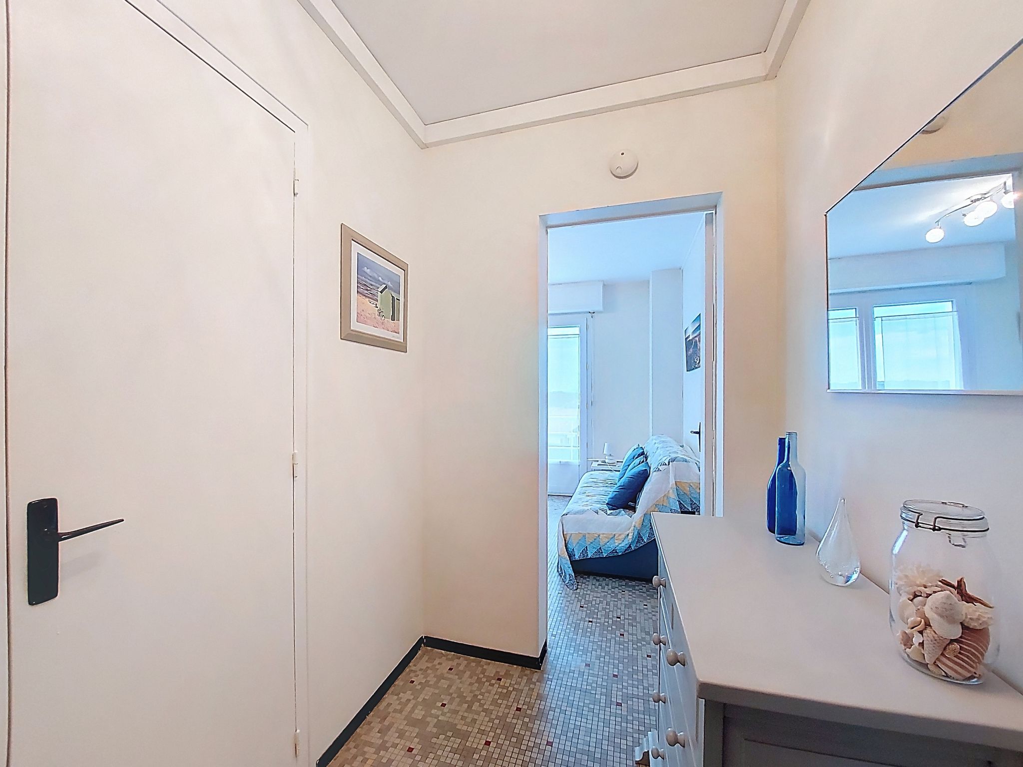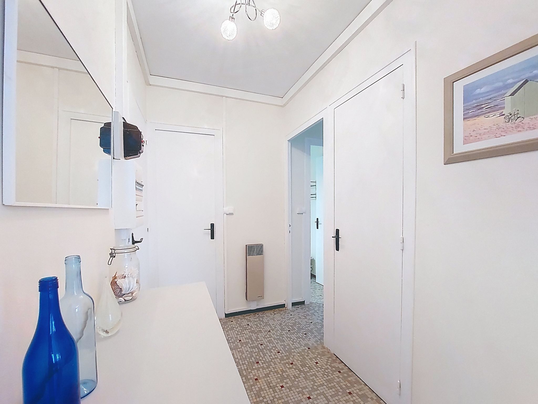 2-room apartment 50 m2 on 3rd floor. Comfortable and beautiful furnishings: living/dining room with 1 sofabed (140 cm, length 190 cm). 1 room with 1 french bed (160 cm, length 190 cm). Kitchen (4 hot plates, oven, toaster, kettle, microwave, electric coffee machine). Bathroom, sep. WC. Electric heating. Terrace 10 m2, roofed, east facing position. Terrace furniture. Facilities: washing machine, iron, hair dryer. Internet (WiFi, extra). Please note: non-smokers only. Smoke alarm. Offer by a private individual according to Art. 155, IV of CGI. 40304002108SA