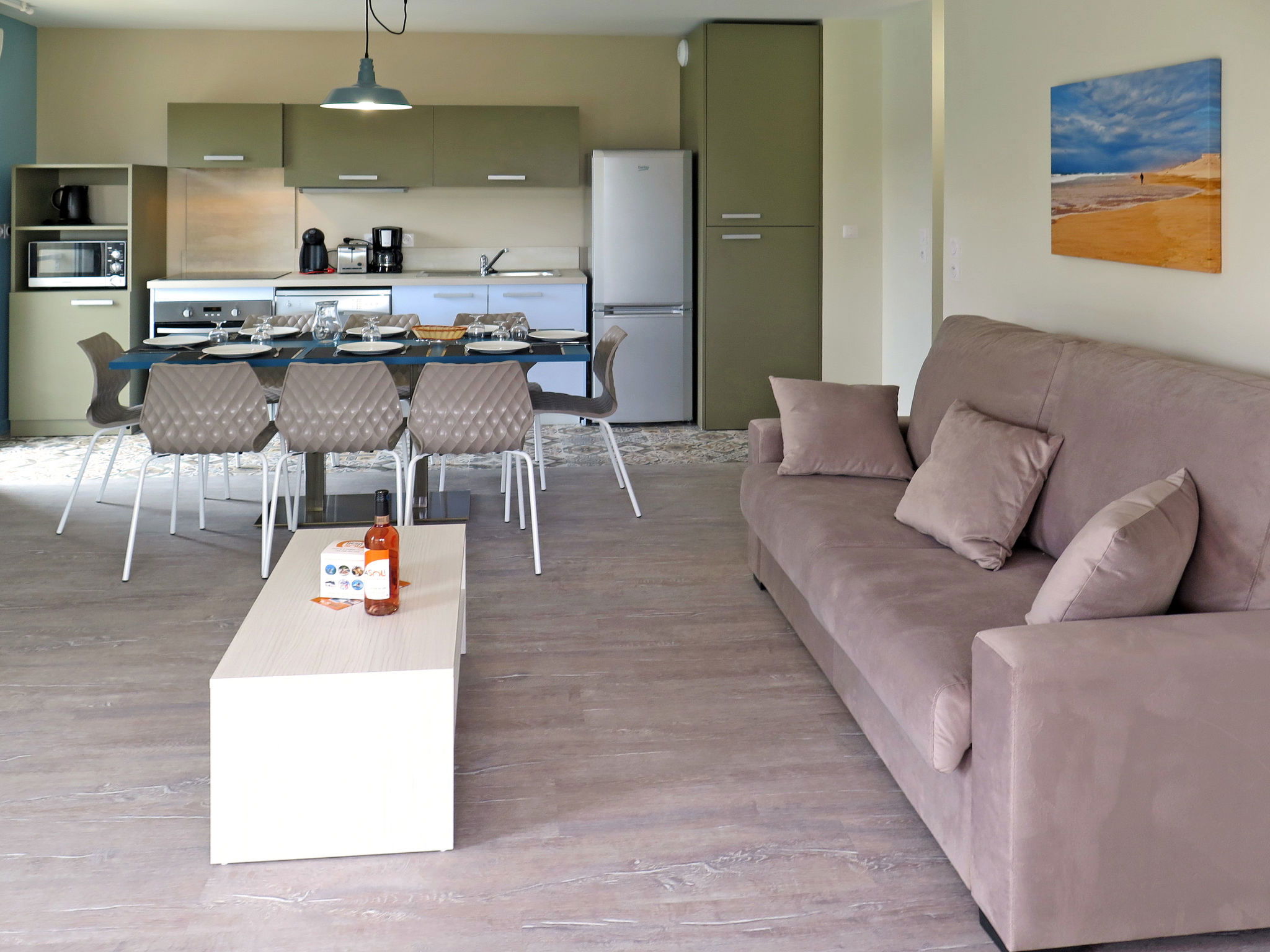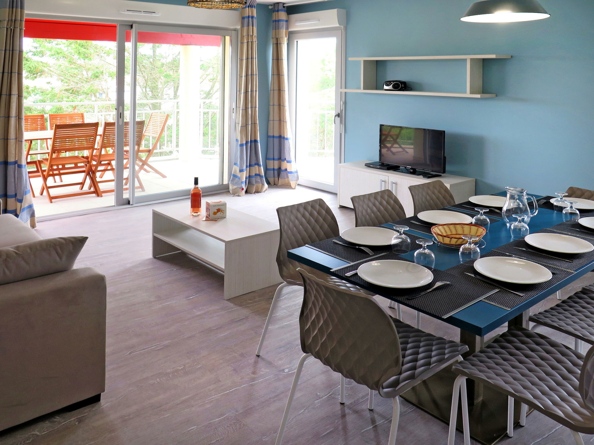 "Les Sables d’Or T4", 4-room apartment 80 m2. Modern and cosy furnishings: living/sleeping room with 1 double sofabed, dining table, TV, radio, CD-player and DVD. 2 rooms, each room with 1 french bed " 1.5 km, sandy beach 350 m, bathing lake "Lac Marin de Port d'Albret" 1 km. Golf course (18 hole) 9 km, tennis 750 m. The owner does not accept any youth groups. Please note: the photograph shows a typical example. The holiday properties may differ in living space, floorplan, equipment and furnishing.