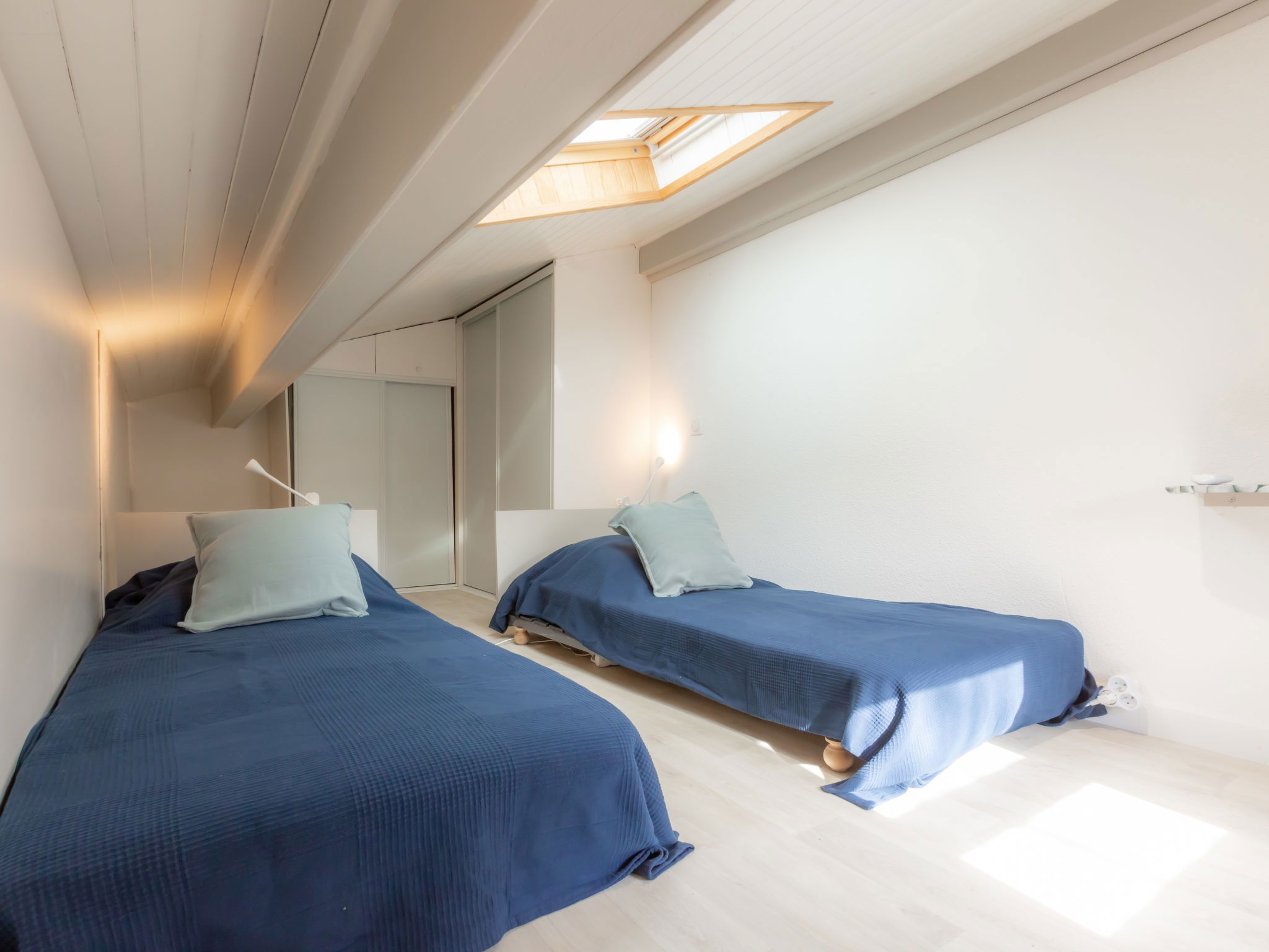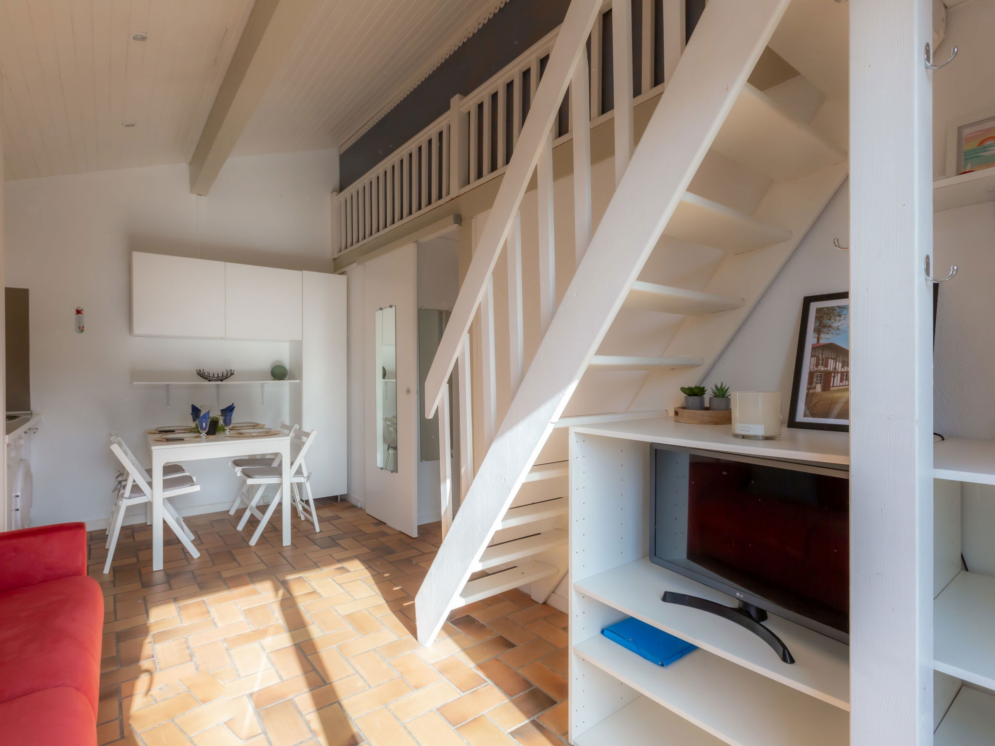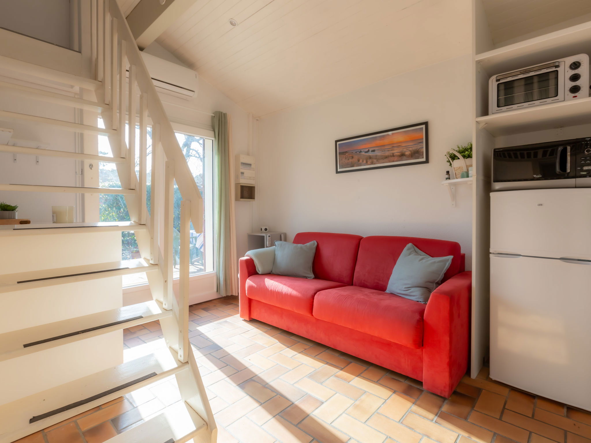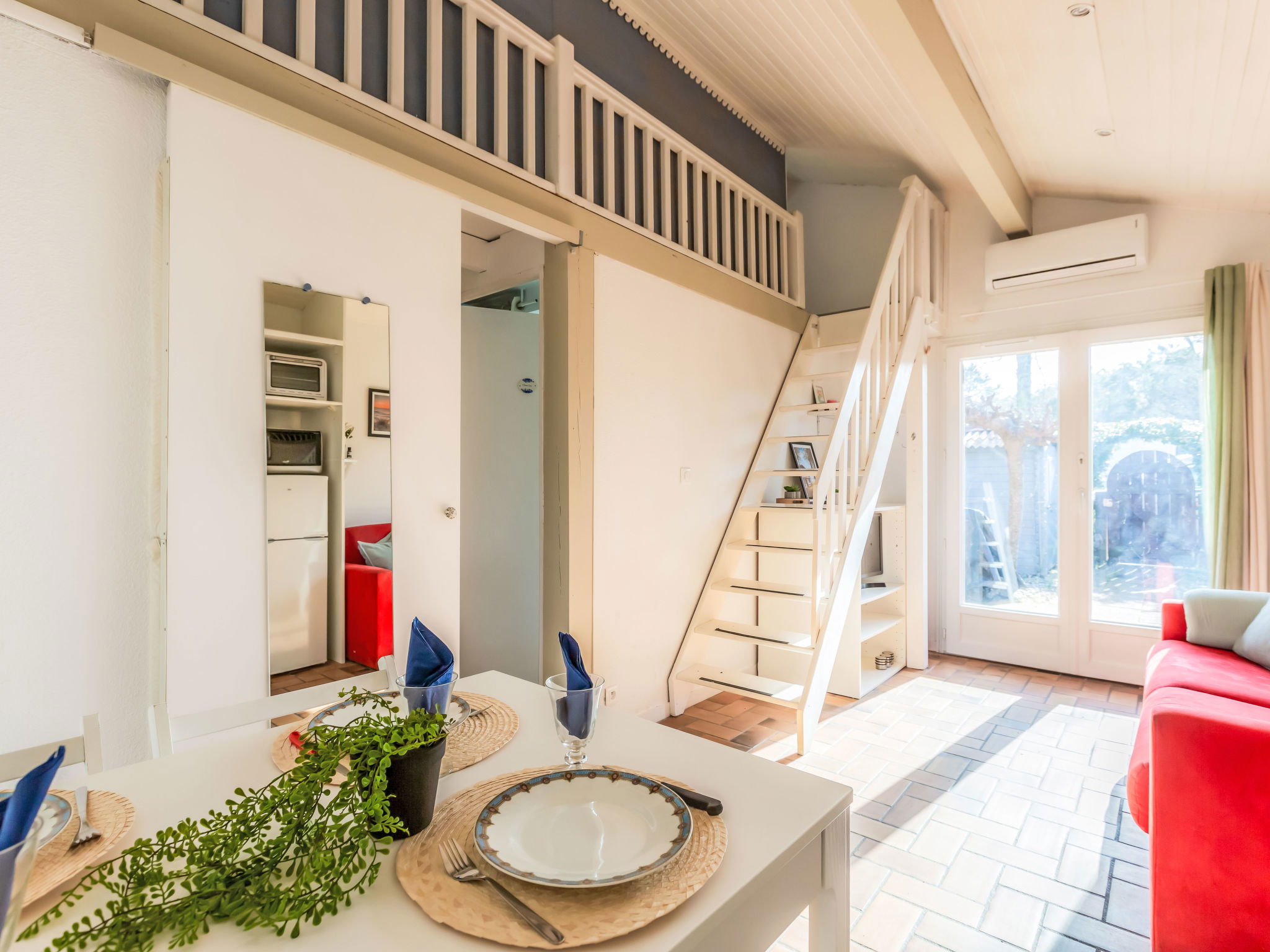 2-room terraced house 25 m2 on 2 levels. Object suitable for 2 adults + 2 children. Living/dining room with TV (flat screen), air conditioning. Exit to the terrace, to the patio. 1 room with 1 french bed (140 cm, length 190 cm). Kitchenette (2 hot plates, oven, dishwasher, toaster, kettle, microwave). Shower, sep. WC. Electric heating. Upper floor: (steep stair), 1 open children's room with sloping ceilings, ceiling height 80 - 170 cm. Terrace 30 m2. Terrace furniture. Facilities: washing machine, iron. Internet (WiFi, extra). Please note: non-smokers only. Smoke alarm. Offer by a private individual according to Art. 155, IV of CGI. 40065002406GW