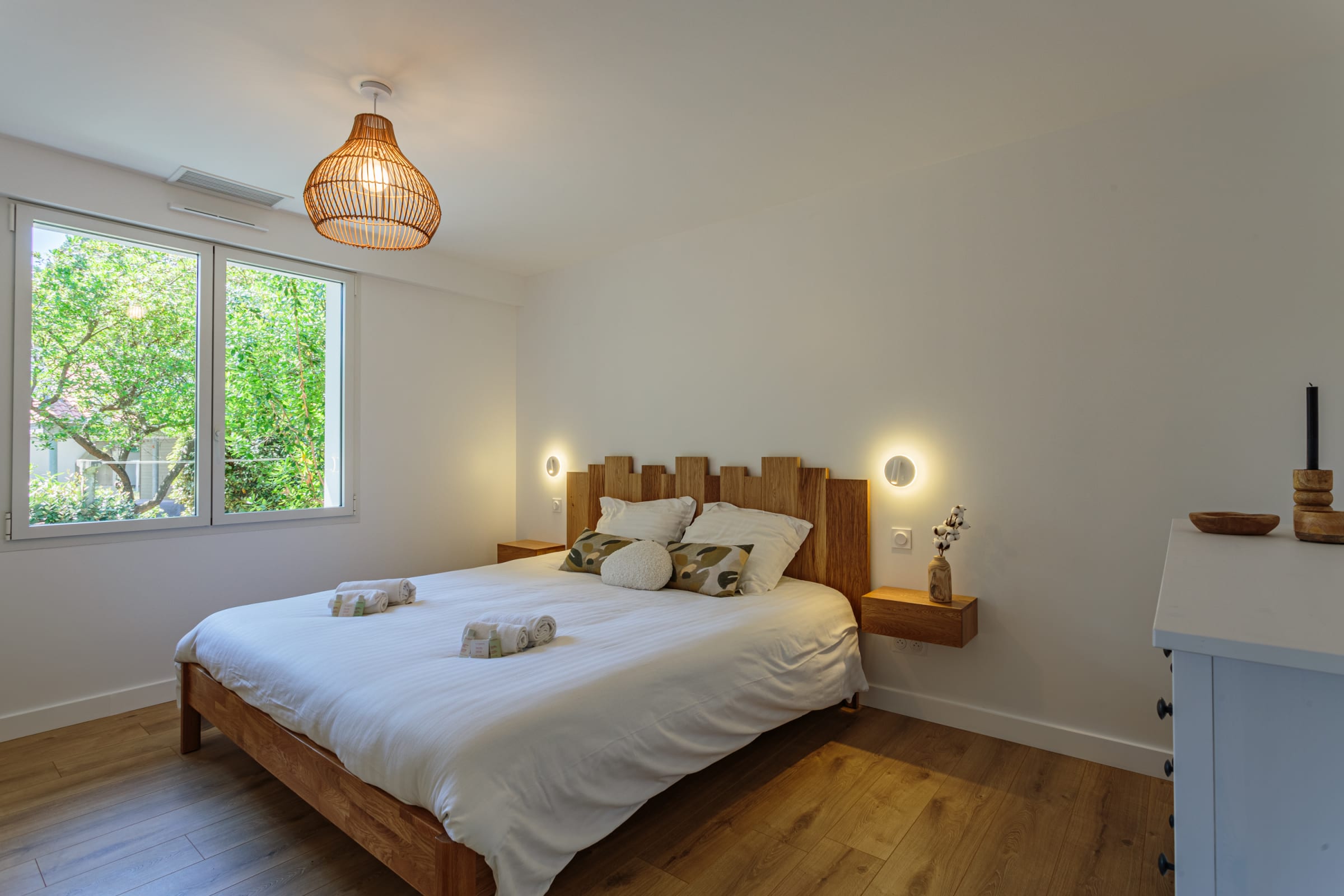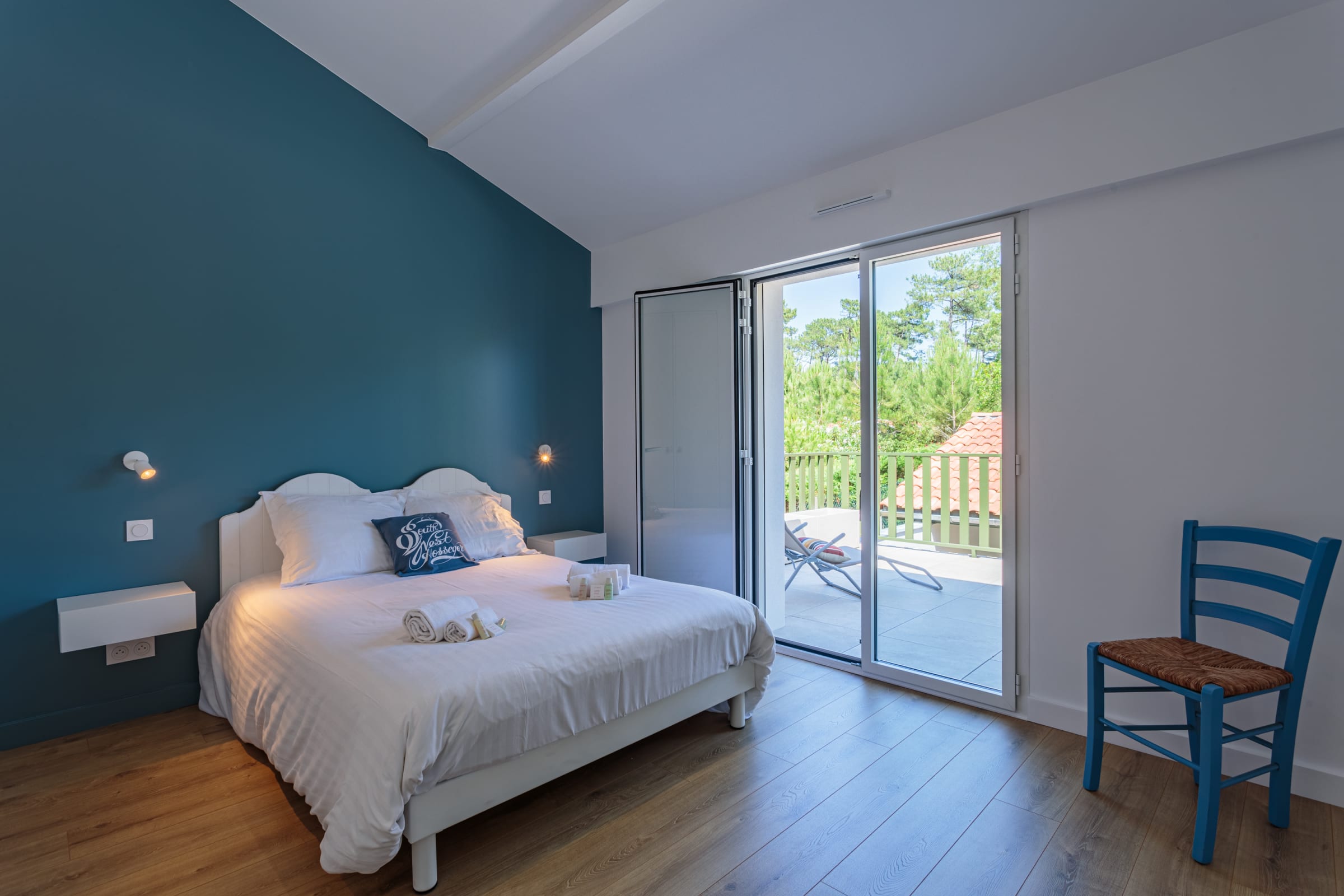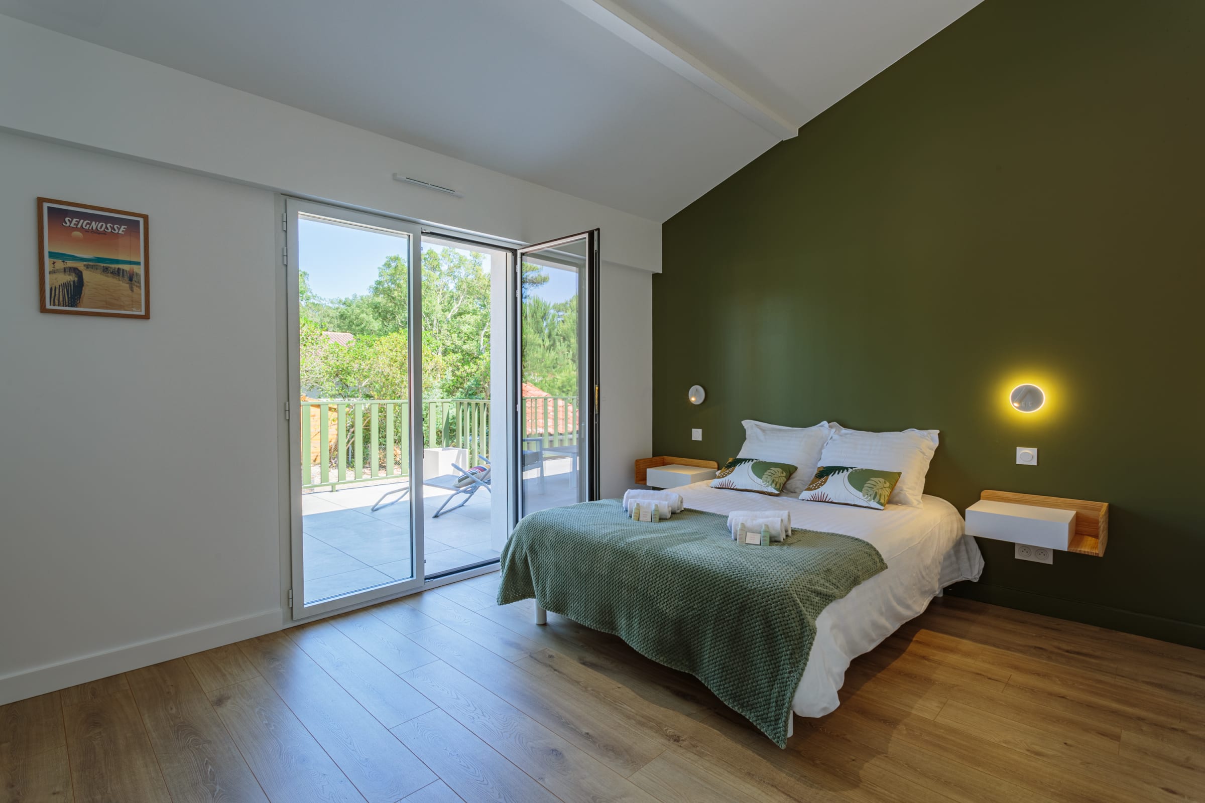 - one bedroom with a queen-size bed (160 cm) and access to the terrace,
